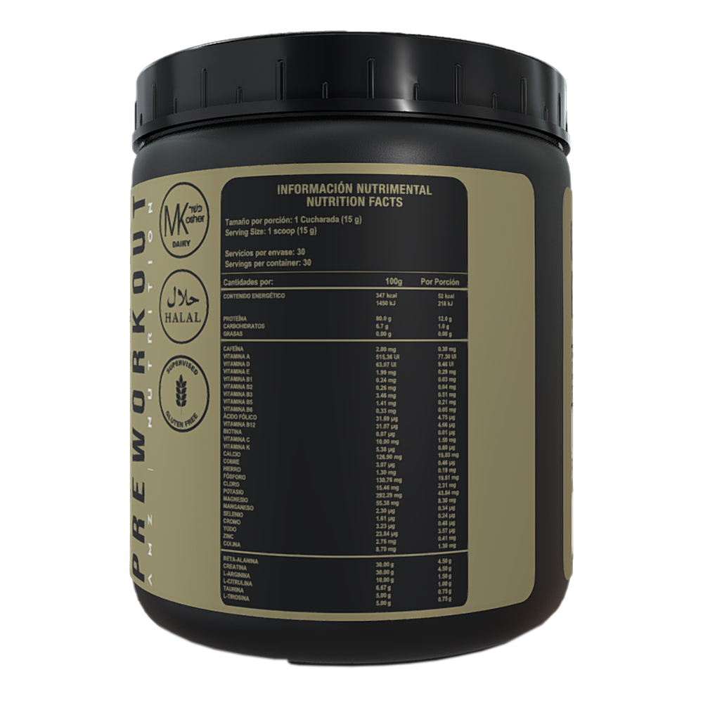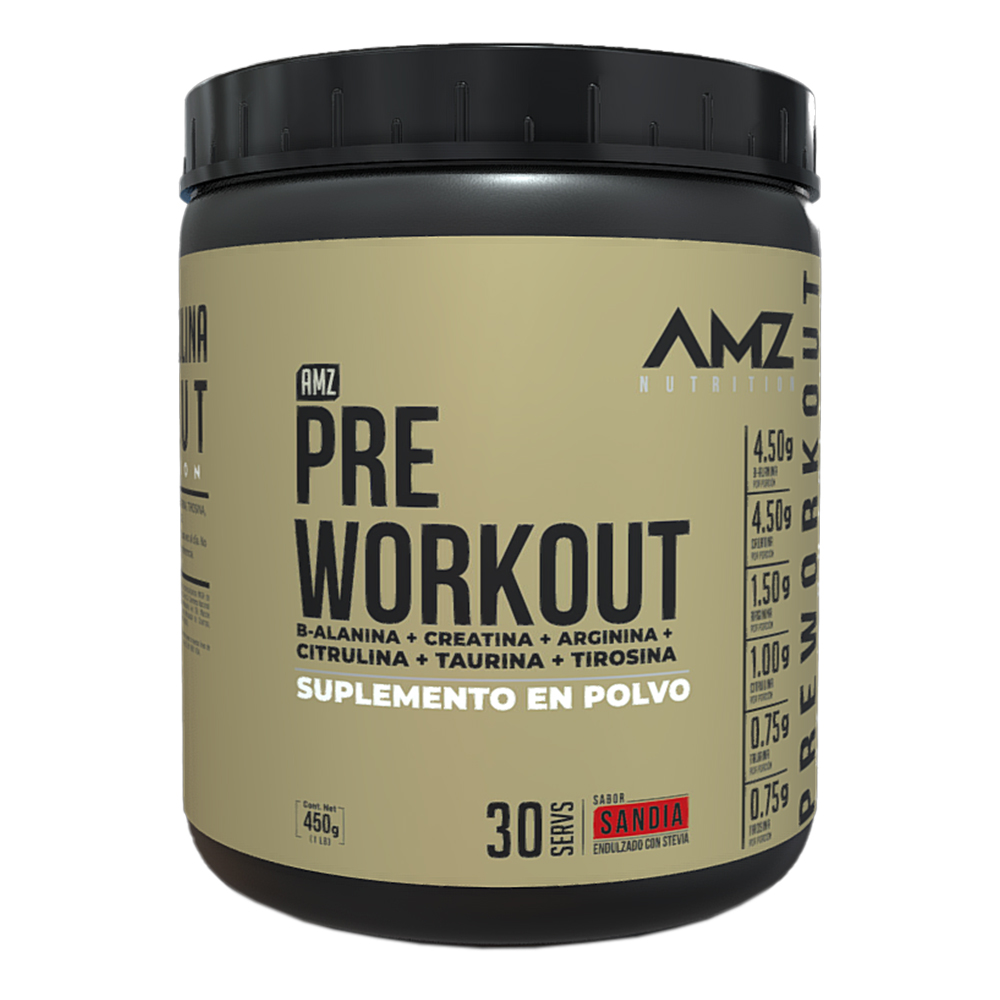 AMZ PRE WORKOUT Es un suplemento alimenticio en polvo a base de B-Alanina, Creatina, L-Arginina, Citrulina, Taurina, Tirosina y Cafeina