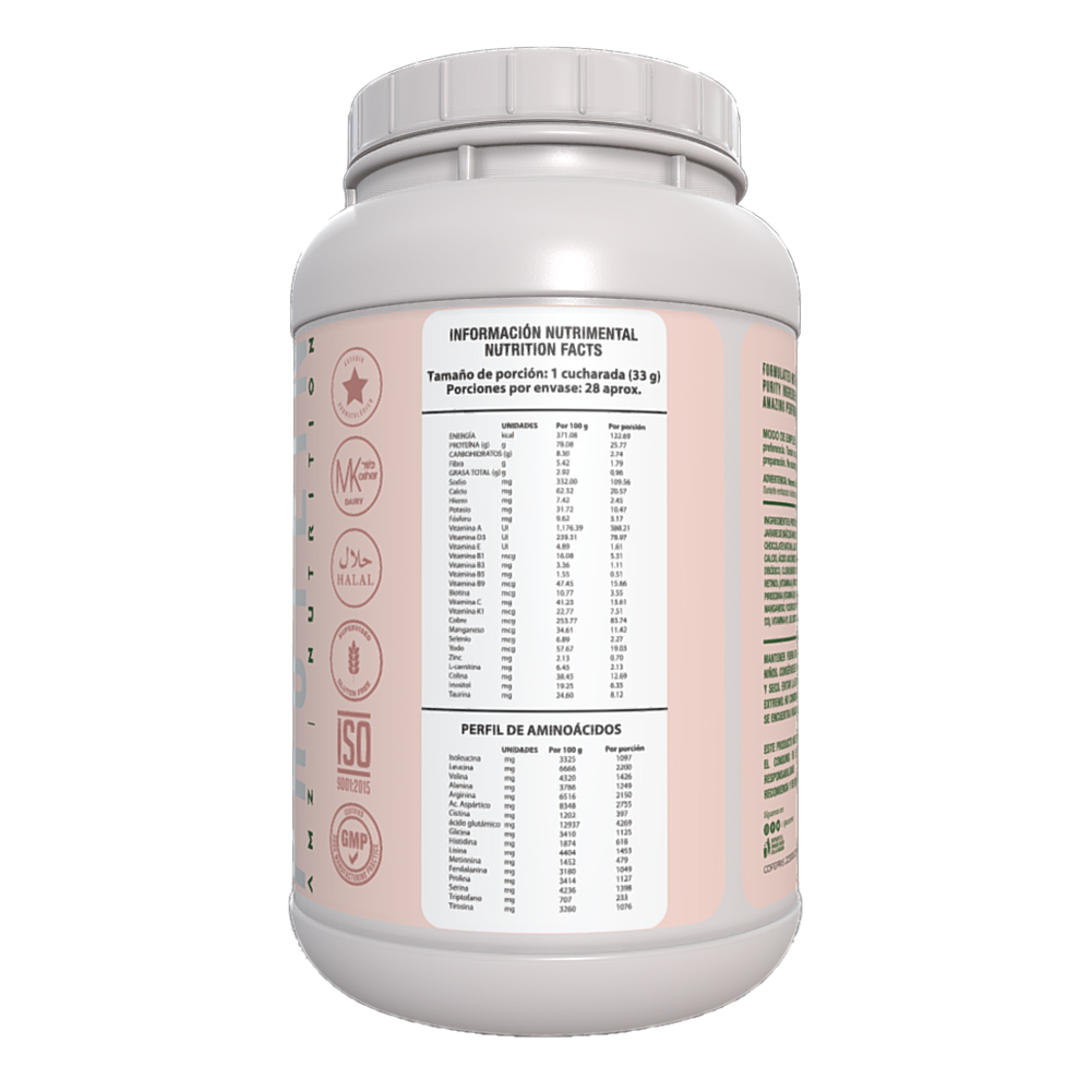 Proteina 25g – BCAA´s 4.7g – Biotina 3.5g – Inositol 6.3g – Taurina 8.1g Diseñada para ayudarlo a pasar de los días laborales a los entrenamientos, nuestra proteína vegetal